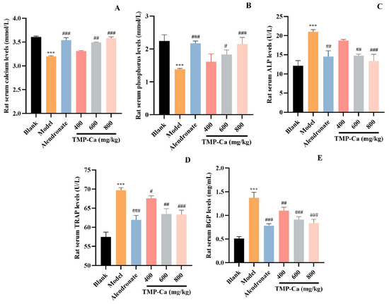 Effect of TMP-Ca chelates on rat blood biochemical indicators. (A) Serum calcium; (B) serum phosphorus; (C) alkaline phosphatase; (D) acid phosphatase; (E) osteocalcin. All values are means ± SD (n = 8). *** p < 0.001 vs. blank group; # p < 0.05, ## p < 0.01, and ### p < 0.001 vs. model group.