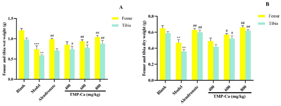 Effect of TMP-Ca chelates on wet weight (A) and dry weight (B) of femur and tibia in retinoic acid-induced rats. All values are means ± SD (n = 8). ** p < 0.01 and *** p < 0.001 vs. blank group; # p < 0.05, ## p < 0.01, vs. model group.