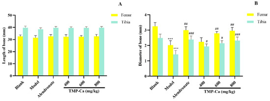 Effect of TMP-Ca chelates on the length (A) and diameter (B) of the femur and tibia in the retinoic acid-induced rats. All the values are means ± SD (n = 8). *** p < 0.001 vs. blank group; # p < 0.05, ## p < 0.01, and ### p < 0.001 vs. model group.
