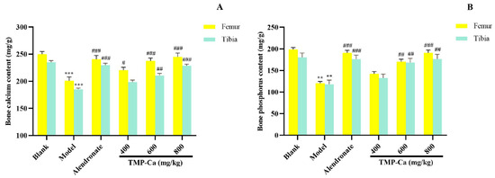 As seen in Figure 8B, the femoral p content of the model group (120.62 ± 4.35 mg/g) (p < 0.001) was notably lower than that of the blank group (198.83 ± 4.34 mg/g), but the high-dose TMP-Ca chelate treatment could significantly increase the p content to 190.99 ± 6.36 mg/g (p < 0.001). For the tibia, the p content of the model group (118.06 ± 9.67 mg/g) (p < 0.001) was significantly lower than that of the blank group (180.59 ± 9.84 mg/g), and the p content significantly increased to 176.62 ± 10.89 mg/g (p < 0.001) after the high-dose TMP-Ca chelate treatment.