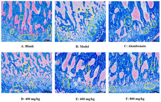 Effect of TMP-Ca chelates on histomorphology of rat femoral head using Masson staining method. Alendronate (5 mg/kg) was used as a positive control. Yellow circles indicate bone trabeculae and epiphyses.
