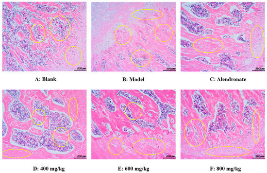 Morphological images of cross-section of femoral epiphysis using H&E staining method. Yellow circles indicate bone trabeculae and epiphyses.