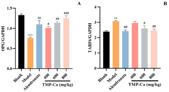 Effect of TMP-Ca chelates on the protein expression of the OPG/TRAF6 signaling pathway. (A) The protein expression of OPG; (B) the protein expression of TRAF6. All the values are means ± SD (n = 8). *** p < 0.001 and ** p < 0.01 vs. blank group; # p < 0.05, ## p < 0.01, and ### p < 0.001 vs. model group.