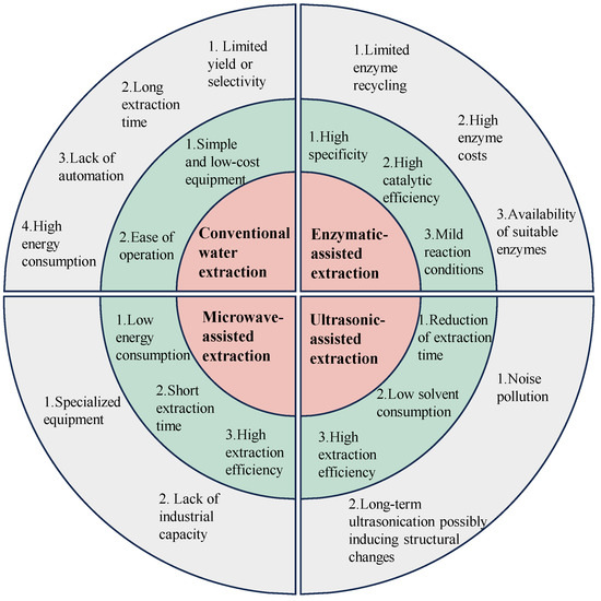 The pros and cons of the conventional extraction method and advanced extraction techniques, including microwave-assisted, ultrasonic-assisted, and enzymatic-assisted extraction. Red indicates the extraction methods, green highlights the advantages of each extraction method, and grey points out the disadvantages of each extraction method.