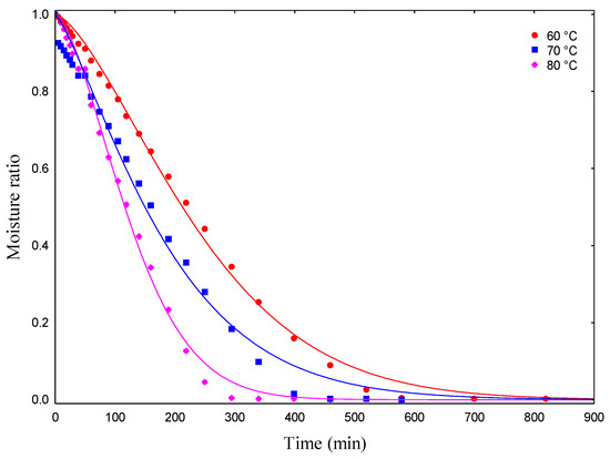Figure 1 shows the drying curves (60, 70, and 80 °C) of WBP with the fits of the Page model. The curves conform to the typical constant rate drying curve described by Geankoplis [51].