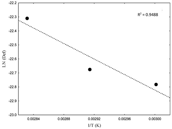 In relation to the dependence of Def on temperature, the expression described by Arrhenius was applied (Equation (12)).