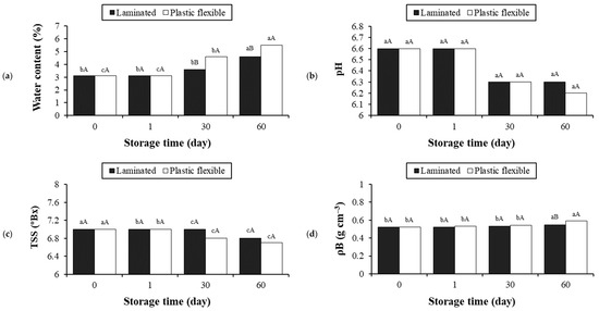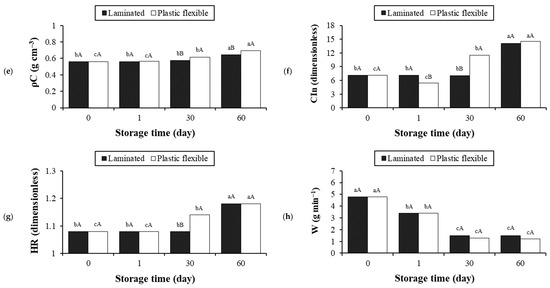 Results of water content (a), pH (b), TSS (c), (d), (e), CIn (f), HR (g), and W (h) for the stability of flours in laminated and plastic flexible packaging during 60 days of storage (average of 25 ± 2 °C). TSSs, total soluble solids; , bulk density; , tapped density; CIn, Carr index; HR, Hausner ratio; W, wettability. a–c: different lowercase letters at different storage times denote difference (p < 0.05; Tukey’s test); A,B: different capital letters at the same storage time denote difference (p < 0.05; Tukey’s test).