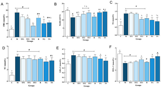 Abnormal serum biochemical indexes are closely linked to T2DM, of which blood glucose and insulin are important markers of glucose metabolism and islet function. As can be seen in Figure 1A, the FBG (18.21 ± 2.69 mmol/L) of mice in the M model group was significantly higher than that in the C group (p < 0.05). The level of FBG in the TF3 group decreased significantly (p < 0.05) compared with that in the GABA (TG) and metformin (TS) positive control group, by 21.05% and 29.66%, respectively. The results showed that the GABA-rich adzuki bean had a certain effect on blood glucose, and the change in blood glucose was related to intake. Figure 1B compares the serum insulin levels of mice in different groups. The INS content of mice in the M model group was significantly lower than that of mice in the C group (p < 0.05), indicating the insulin deficiency of mice in the M group. In addition, type 2 diabetes mellitus is often accompanied by lipid metabolism disorder; the serum lipid factors of T2DM mice in different dietary intervention groups were detected (Figure 1C–F). Compared with the control group, the levels of TG, TC, and LDL-C in the M model group were significantly increased (p < 0.05, Figure 1C,D) and the levels of HDL-C were significantly increased (p < 0.05, Figure 1F). It was revealed that the diabetic mice, whose condition was induced by a high-fat diet combined with STZ, had severe dyslipidemia. After 6 weeks of GABA-rich adzuki bean and drug intervention, the levels of TG, TC, and LDL-C in the TG and TS groups were significantly increased, and the levels of HDL-C in the TG group were not significantly different (p > 0.05).
