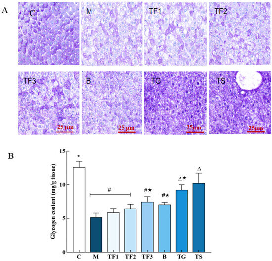 After PAS staining, the liver glycogen of the normal control group C showed deep purple staining; the amount of liver glycogen in the M model group was obvious, and there were more fat vacuoles. After 6 weeks of intervention with the different doses of GABA-rich adzuki beans and metformin treatment, it was found that the liver glycogen staining degree of TF1, TF2, and TF3 treatment increased with the dose, and the effect in the high-dose TF3 group was second only to the TG and TS positive control (Figure 2A). The quantitative results of glycogen content and the PAS staining results were complimentary. From Figure 2B, it can be seen that the glycogen content of T2DM mice in the M model group is significantly lower than that in the C control group. Different doses of GABA-rich adzuki beans and drug treatment can improve the liver glycogen content in mice to different degrees. The ability of TF3, TG, and TS groups to recover glycogen synthesis in T2DM mice may promote liver glycogen synthesis in T2DM mice by alleviating liver lipid peroxidation and histological damage.