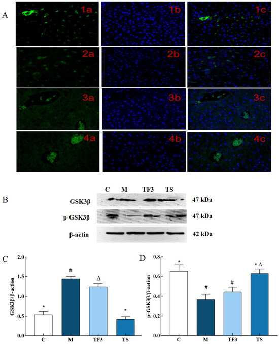 In this study, the representative experimental groups of C, M, TF3, and TS were selected to evaluate the expression status of GSK3β in mouse liver cells via immunofluorescence and the expression levels of p-GSK3β and GSK3β protein via Western blotting. The results are shown in Figure 3.
