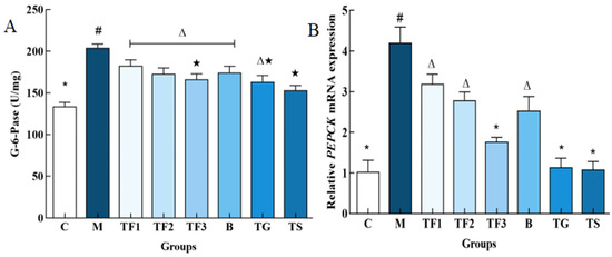 It can be seen from Figure 4 that the activities of G-6-Pase and PEPCK in the liver of the M model group are significantly higher than those of the normal control group C and other dietary and drug treatment groups (p < 0.05). The activities of G-6-Pase and PEPCK in the M group are 1.52 times higher than those in the C group and 2.31 times higher than those in the C group. The activities of PEPCK in TF3, TG, and TS groups are 41.5%, 40.02%, and 46.16%, respectively, and there were no significant differences among the three groups (p > 0.05). The results further prove that a GABA-rich adzuki bean diet could inhibit glycogen decomposition, the gluconeogenesis rate-limiting enzyme G-6-Pase, and PEPCK activities in T2DM mice, suggesting that it promotes the glycolysis pathway in reverse and then regulates blood glucose concentration in T2DM mice and alleviates hyperglycemia symptoms in mice.