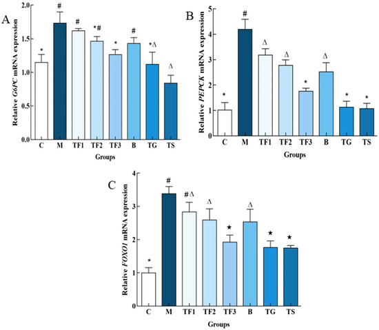 Effects of different treatments on the expression of glucose metabolism-related genes in mice. (A) Shows the relative expression level of the G6PC gene; (B) shows the relative expression level of the PEPCK gene; and (C) shows FOXO1. There are significant differences among different characters in the figure (p < 0.05). Abbreviations in the picture: normal control (C); model group (M); HFD + low-dose GABA-rich adzuki bean group (TF1); HFD + medium-dose GABA-rich adzuki bean group (TF2): HFD + GABA-rich adzuki bean (TF3); adzuki bean intervention group (B); HFD + GABA intervention group (TG); and HFD + metformin group (TS).