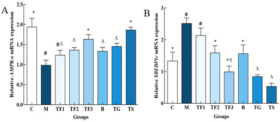 As shown in Figure 6A, the expression level of the AMPKα gene in the liver of mice in the M model group was significantly lower than that in the C group (p < 0.05). The medium- and high-dose GABA-rich adzuki bean groups and metformin groups exhibited significant up-regulation of the expression level of AMPKα in T2DM mice, among which the TF3 high-dose group exhibited an increased expression level of the AMPKα gene by 2.09-fold. There were no significant differences compared with the normal TG and C groups (p > 0.05). Figure 6B shows that the expression level of the SREBP1c gene in the M model group is significantly higher than that in the C group and the medium- and high-dose diet group. The TF2, TF3, B, TG, and TS groups exhibited a significant down-regulation in the expression level of the SREBP1c gene in the liver of T2DM mice (p < 0.05), but there were no significant differences between TF3, TG, and TS (p > 0.05).