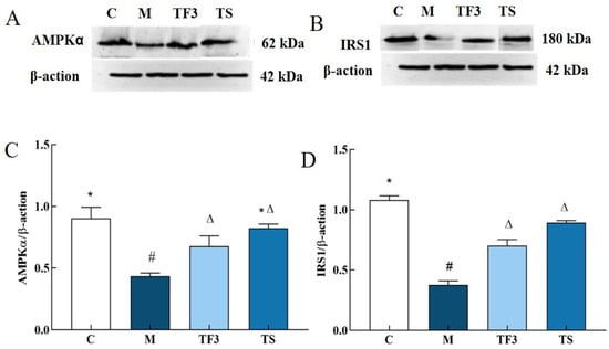 The expression of the insulin pathway factor AMPKα and the IRS 1 protein is shown in Figure 7. Compared with the normal group, the expression of AMPK α and the IRS proteins in the liver of the M model group were significantly down-regulated. After 6 weeks of dietary and drug intervention, the expression of the AMPKα and IRS proteins in the liver of the TF3 and TS groups were significantly up-regulated compared with those of the M model group (p < 0.05), and there were no significant differences between the two groups (p > 0.05).