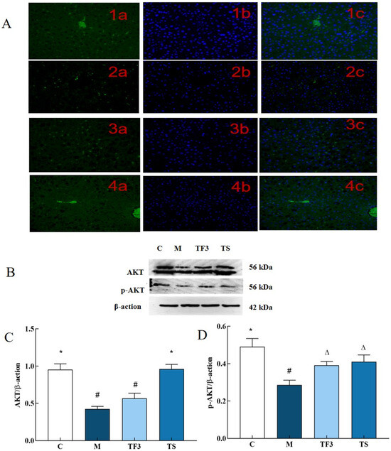 Effects of different groups on the expression of the AKT and p-AKT protein in the liver of mice. (A) 1 stands for C group; 2 stands for M model group; 3 stands for TF3, high-dose adzuki bean group rich in GABA; and 4 stands for TS metformin group, in which a was FITC labeled, b was DAPI restained nucleus, and c was merged. (B) Shows the protein bands of AKT and its phosphorylated p-AKT. (C) Shows the expression level of the AKT protein in different groups of mice. (D) Shows the phosphorylation expression level of the p-AKT protein. There were significant differences among the groups represented by different characters (p < 0.05). Abbreviations in the picture: normal control (C); model group (M); HFD + GABA-rich adzuki bean (TF3); and HFD + metformin group (TS).