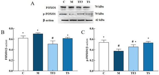 Western blot technology was used to detect the gene protein expression of p-GSK3β, GSK3β, IRS1, PI3K, AKT, p-AKT, AMPKα, FOXO1, and p-FOXO1 in the liver tissues of mice in the C, M, TF3, and TS groups. For the specific methods, refer to Han. X. With minor modification, each 100 mg mouse liver sample was added to 500 µL of lysate-containing phosphatase inhibitor and quickly ground into powder on ice. This powder was subjected to a static reaction for 30 min and centrifuged at a low temperature at 1.2 × 104× g for 15 min. The protein concentration of the above extraction solution was detected via the BCA protein kit method. Then, DS-PAGE electrophoresis, membrane transfer, and immune reactions were performed, and finally, development and analysis were performed [16].