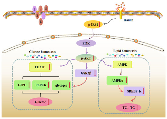 When IR occurs in the liver, the tyrosine phosphorylation of IRS1 is severely damaged by hyperglycemia, leading to a decrease in the liver’s ability to absorb glucose, affecting proximal defects in the INSR, IRS1, PI3K, and AKT pathways and impairing the insulin transduction pathway. It appears that the activity of insulin hinders the synthesis of glycogen in the liver, and at the same time, the gluconeogenesis pathway affects the concentration of blood sugar in many respects, eventually causing metabolic diseases such as hyperglycemia and hyperlipidemia [29]. As mentioned before, FOXO1 is the target of AKT, and the main phosphorylation sites are Thr24, Ser256, and Ser319 [30]. On the one hand, FOXO1 can activate threonine phosphorylation under the regulation of the upstream PI3K/AKT pathway and trigger nuclear translocation, resulting in a decrease in the transcription ability of FOXO1 and thereby inhibiting the expression levels of PEPCK and G6PC genes in the liver. On the other hand, FOXO1 acts as a transcription factor that can tightly bind to the DNA target sequence in the promoter region of the gluconeogenesis rate-limiting enzyme and regulate the gene expression of important enzymes such as PEPCK and G-6-Pase in the gluconeogenesis pathway. It can be seen that FOXO1, GSK3β, AMPK, and other proteins are important regulatory factors in the insulin pathway. By increasing the phosphorylation expression levels of GSK3β and FOXO1 proteins, the activity of GSK3β and FOXO1 factors can be inhibited, thereby increasing the activity of GYS2 and inhibiting downstream gluconeogenesis. The activities of the key rate-limiting enzymes PEPCK and G-6-Pase enhance the ability of liver glycogen production and storage.