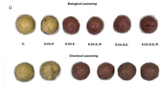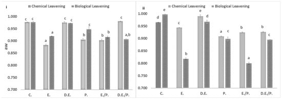Water activity of doughs. Data are presented as the average values of three replications ± standard deviation. Lowercase letters indicate significant differences (p < 0.05) at a 95% confidence level. (i) Cherry; (ii) S. Cherry; C.: Control sample; E.: Extract; D.E.: Dehydrated Extract; P.: Pulverized Fruit; E./P.: Extract combined with pulverized fruit; D.E./P.: Dehydrated Extract combined with pulverized fruit.