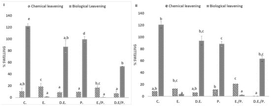 Swelling Capacity (%). Data are presented as the average values of three replications ± standard deviation. Lowercase letters indicate significant differences (p < 0.05) at a 95% confidence level. (i) Cherry; (ii) S. Cherry; C.: Control sample; E.: Extract; D.E.: Dehydrated Extract; P.: Pulverized Fruit; E./P.: Extract combined with pulverized fruit; D.E./P.: Dehydrated Extract combined with pulverized fruit.