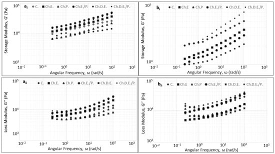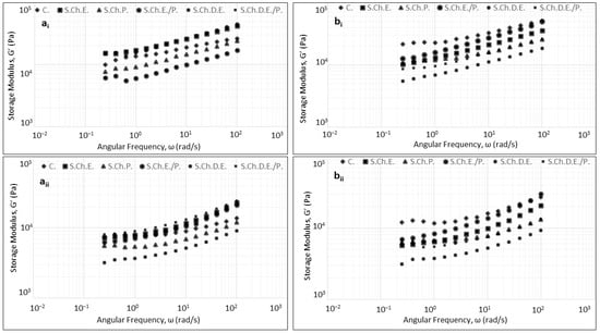 Impact of the addition of enrichment agents based on cherry extract and powder forms on (ai) Storage Modulus and (aii) Loss Modulus for chemically leavened doughs and (bi) Storage Modulus and (bii) Loss Modulus for chemically leavened doughs.