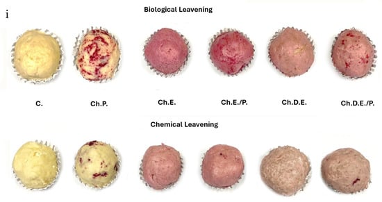 The physicochemical properties of dough samples enriched with red fruit phytochemical-rich formulations are given in Table 1. As shown in this Table, the two sources (Ch. and S.Ch.) of bioactive phytochemicals displayed different interaction patterns in terms of color variation (ΔE), pH, and total phenolic content in the same matrix (wheat-based dough). These differences were based on the enrichment forms’ chemical composition (TPC, pH, and ethanol content) and the origin of the fruit (Ch. and S.Ch.). The initial phenolic content and various enrichment forms (extract, dehydrated extract, pulverized fruit, extract combined with pulverized fruit, and dehydrated extract combined with pulverized fruit) presented significant differences between fruits (Table A2). The prevalence of S.Ch. in terms of higher TPC was exhibited in all types of different enrichment forms applied, as shown in Table 1. Figure 1 presents the color variation.