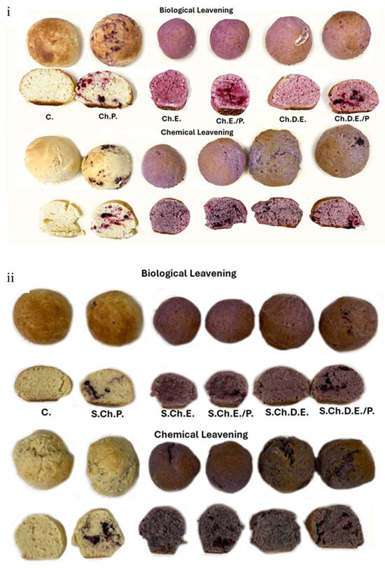 Two raising agents were used for each trial, baking powder (sodium pyrophosphate/sodium bicarbonate (chemical leavening)) and Saccharomyces cerevisiae (biological leavening). Control samples (blank formulations), without the incorporation of phytochemical-rich compounds, were also prepared. Bread-making, proofing, and baking process were performed as previously described [5].