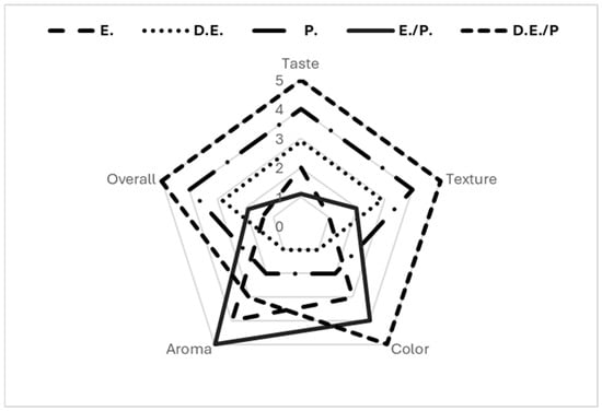 Organoleptic evaluation of enriched breads. Data are presented as the average values. C.: Control sample; E.: Extract; D.E.: Dehydrated Extract; P.: Pulverized Fruit; E./P.: Extract combined with pulverized fruit; D.E./P.: Dehydrated Extract combined with pulverized fruit.