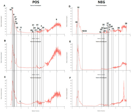 Firstly, the active ingredients of AHT were identified, and a total of 1539 metabolites were detected by LC-MS. These metabolites include a series of compounds such as flavonoids, polyphenols, terpenes, and alkaloids. Then, 1539 compounds were identified and analyzed through the TCMSP database. Setting oral bioavailability (OB) ≥ 30% and drug-like (DL) ≥ 0.18, 41 compounds were obtained, as shown in Table 1, including bioactive ingredients such as luteolin, quercetin, isorhamnetin, and kaempferol. Next, a qualitative analysis of AHT was conducted, summarizing the retention time, m/z, molecular formula, and error (ppm) of 41 compounds (Table 2). In addition, the total ion chromatogram (TIC) of AHT in positive and negative ion modes was labeled based on the retention time of the compounds (Figure 1).