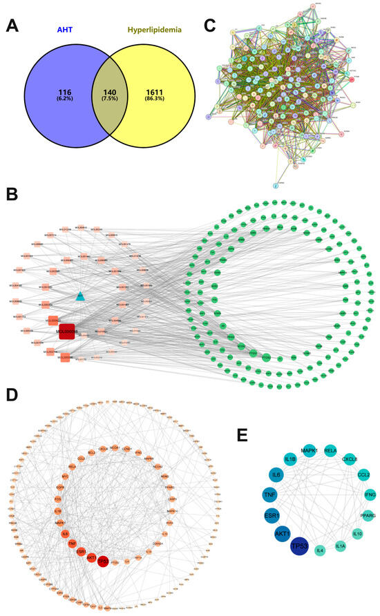 Network pharmacology analysis of AHT treatment for hyperlipidemia. (A) Common targets of AHT and HLP. (B) AHT compound target network diagram. (C) Analysis of protein–protein interaction networks with 140 common targets. (D) PPI network diagram of common targets. (E) Core target PPI network diagram (node size and color depth indicate the high or low DC value).