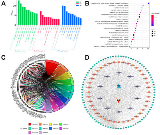 Network pharmacology pathway analysis of AHT treatment for HLP. (A) GO enrichment analysis. (B) The top 20 KEGG enrichment pathways. (C) KEGG chord diagram, it indicated the top 10 pathways and their corresponding targets; the different colors of the graphics represent different signal pathways. (D) Compound–target–pathway–disease network diagram.