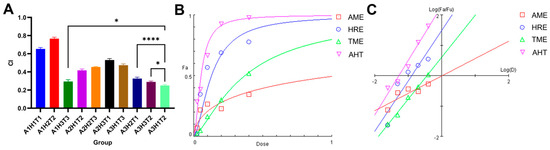 Combination Index analysis of AHT, AME, HRE, and TME. (A) CI values are combined in different proportions. (B) Dose effect curves of AHT, AME, HRE, and TME on pancreatic lipase inhibition. (C) Intermediate effect diagrams of AHT, AME, HRE, and TME. (n = 3, **** and * represent p < 0.01 and p < 0.05, respectively).