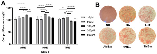 HepG2 cells were derived from the cell bank of the Chinese Academy of Sciences (Shanghai, China); DMEM was used (adding 10% fetal bovine serum and 1% penicillin and streptomycin); and the cells were cultured in a humidified incubator at 37 ℃ and 5% CO2, and the medium was changed every two to three days. When the cell density reached over 80%, trypsin was used for subculture [28]. HepG2 cells were detected for cell proliferation using an MTT assay. The cells were seeded at a density of 5 × 103 cells/well into a 96-well plate for 24 h and then replaced with standard culture medium containing different concentrations (0, 10, 50, 100, 200, and 500 μM) of HRE, AME, TME, and AHT for 24 h. Then, 10 μL of MTT solution were added and the cells were incubated for 4 h. Afterward, 150 μL of dimethyl sulfoxide was added to each well and the absorbance value was measured at 490 nm using a microplate reader (Tecan Infinite 200 Pro, Shanghai, China) [17,29].