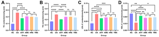 Determination of AHT lipid-lowering levels. (A) TC. (B) TG. (C) LDL-C. (D) HDL-C. (n = 3, ****, ***, **, *, and ns represent p < 0.0001, p < 0.001, p < 0.01, p < 0.05, and p > 0.05, respectively).