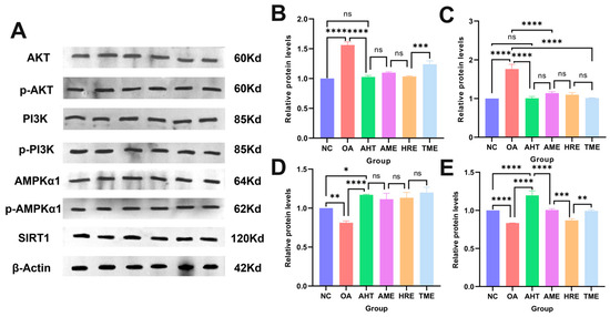 The effect of AHT on critical proteins in the PI3K Akt signaling pathway and MAPK signaling pathway. (A) Immunoblot analysis of related proteins. (B) The ratio of p-AKT/AKT protein quantification results. (C) The ratio of p-PI3K/PI3K protein quantification results. (D) The ratio of p-AMPK/AMPK protein quantification results. (E) SIRT1 protein quantification results. (n = 3, ****, ***, **, *, and ns represent p < 0.0001, p < 0.001, p < 0.01, p < 0.05, and p > 0.05, respectively).