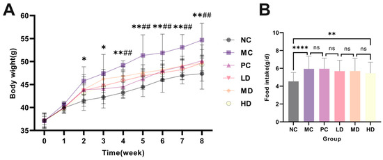 Body weight and food intake of mice. (A) Changes in body weight of mice in each group during 8 w. (n = 8, *, ** represent significant and extremely significant differences between the MC group and the NC group (p < 0.05, p < 0.01); ## represents extremely significant differences between the MC group and the HD group (p < 0.05). (B) During the 8 w period, the food intake of mice in each group. (n = 3, ****, **, and ns represent p < 0.0001, p < 0.01, and p > 0.05, respectively).