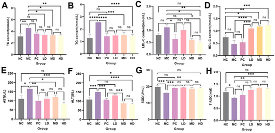 Serum indicators. (A) TC. (B) TG. (C) LDL-C. (D) HDL-C. (E) AST. (F) ALT. (G) SOD. (H) T-AOC. (n = 3, ****, ***, **, *, and ns represent p < 0.0001, p < 0.001, p < 0.01, p < 0.05, and p > 0.05, respectively).
