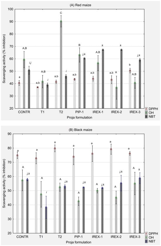 Antioxidant capacity of proja made from red (A) and black (B) coloured maize. DPPH represents DPPH-radical scavenging activity; OH denotes hydroxyl radical scavenging activity; NBT represents superoxide anion inhibitory activity. The vertical bars represent mean ± standard deviation of each data point (n = 6). Bars designated with equal letters of the same typesetting are not statistically significant (p > 0.05) according to Tukey’s (HSD) test.