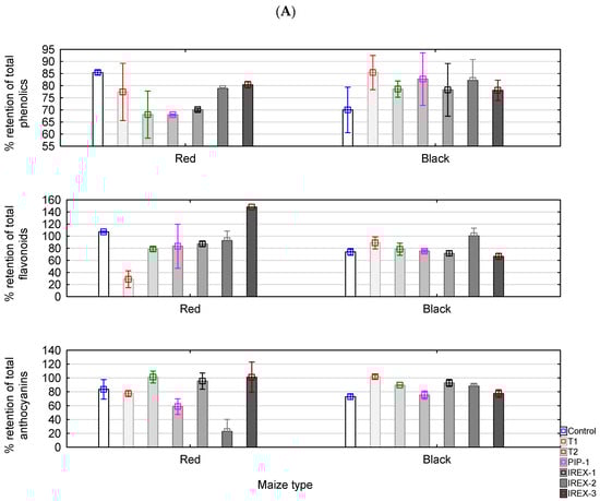 Data on the retention of total phenolics, total flavonoids, and total anthocyanins following baking are displayed in Figure 2. In red maize proja, 67–85% of total phenolics were retained (Figure 2A). Similar ranges could be observed in black maize proja, 69–85%. When different proja formulations were individually compared to their corresponding counterparts between red and black datasets, slightly higher retentions were noted in proja from black maize but did not reach statistical significance. The retention pattern for total flavonoids and anthocyanins was more scattered, with higher variations among the analysed proja formulations. For red maize proja, it ranged from 28% to 137% for total flavonoids and from 22 to 101% for total anthocyanins (Figure 2A). On the other hand, in black maize proja, retention of total flavonoids and anthocyanins was in the range of 67–100%, i.e., 73–102%, respectively (Figure 2A). Observing the whole dataset in general, in the majority of samples, we see that flavonoids were retained in the range of 66–90%, while anthocyanin retention indices were between 58 and 93%. Proja made from black maize showed higher retention of all observed bioactive compounds in all formulations other than control. In contrast, in red maize proja, the control sample had higher retention of total phenolics and flavonoids compared to the majority of other proja formulations except for the retention of total flavonoids in IREX-3 formulations.