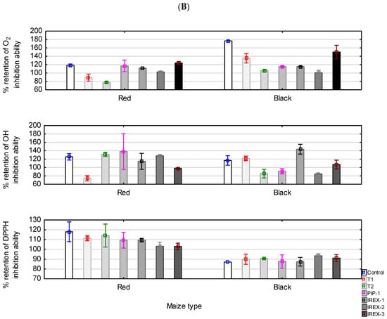 Baking affected the antioxidant properties of proja. Figure 2B displays the retention of antioxidant properties after baking. As can be observed in the majority of cases, increased antioxidant capacity was noted after baking (% retention above 100%). Increased inhibitory activity against DPPH, hydroxyl and superoxide inhibition were measured for most formulations of red and black maize proja, except DPPH inhibition in black maize proja. Nevertheless, around 90% of DPPH inhibitory activity was retained. Retention of OH inhibition capacity in both maize types was not univocal within formulations and ranged from 70% to 170% (Figure 2B). The results indicate that the phenolic compounds remaining in proja after baking were able to retain their activity. Increased antioxidant activity after baking is a frequent pattern and can be explained to be in part due to the liberation of bound phenolic compounds from the matrix and the presence of other products of thermal degradation that exhibit antioxidant properties. Higher antioxidant capacity after cooking pasta prepared from blue maize was reported by Camelo-Méndez et al. [13]. Increased antioxidant activity in cookies after baking due to the formation of Maillard reaction products has been shown in the study of Žilić et al. [22]. The slight difference in the retention of inhibitory activities against tested free radicals in proja from red and black maize is presumably due to different profiles and content of phenolic compounds in these maize cultivars. Different proja formulations significantly affected the retention of the capacity to inhibit free radicals. In the case of DPPH, statistical significance existed among formulations of proja made from red maize in contrast to black maize proja, where different formulations exhibited similar retentions of antioxidant potential that ranged from 87.1 to 93.52%. There was a weak but significant inverse correlation between acidity degree and retention of DPPH inhibitory activity (r2 = −0.35), indicating that higher acidity did not favour the retention of antioxidant activity after proja baking. Considering the retention of activities against superoxide and hydroxyl radicals, variations among different proja formulations were broad but did not follow an explicable trend, and no correlations were found. However, when correlations were performed on separate datasets, the pattern of antioxidant activity retention in red maize proja coincided with the retention of anthocyanins and flavonoids after baking: the remaining inhibitory activities against DPPH could be correlated to the retention of anthocyanins (r2 = 0.46), and activities against superoxide were highly correlated to the retention of flavonoids (r2 = 0.71) in proja after baking.