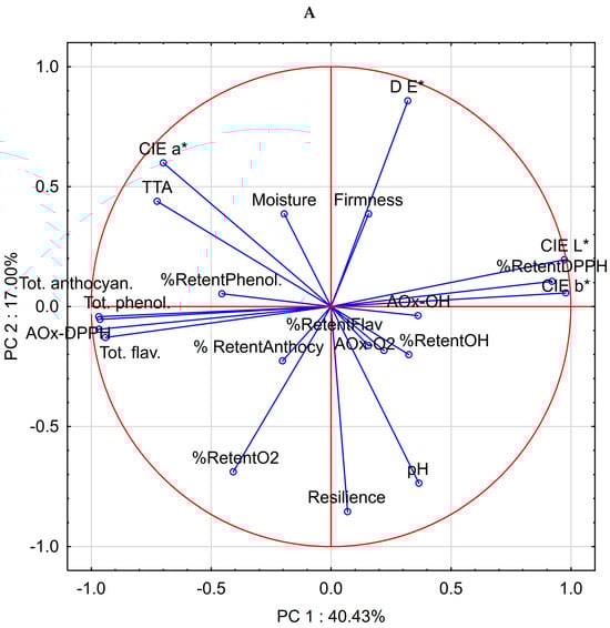 PCA loading (A) and score (B) plots of proja properties (PC1 versus PC2).