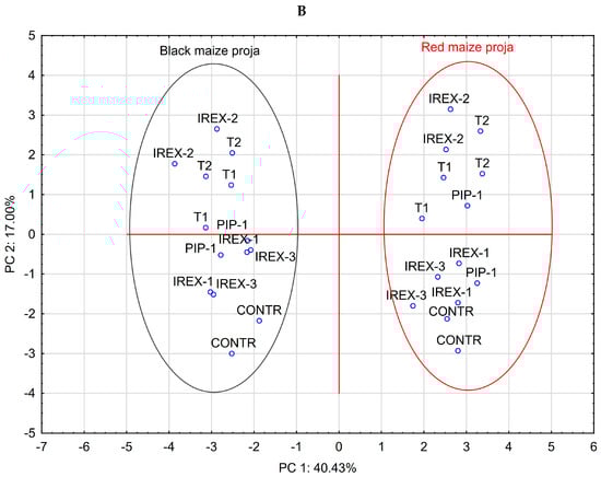 PCA was performed on the dataset to explain the variability in the data. The analysis yielded four PCs, which explains 78.8% of the total variance in the data. Variable contributions are presented in Table 6 to express the correlation between old variables and newly defined principal components (PCs). The first principal component PC1 explained 40.4% variability of the data and correlated well with colour properties (L*, a*, b*), content of bioactive compounds (phenolics, flavonoids, anthocyanins), crumb acidity (TTA), antioxidant activity and its retention (DPPH). The majority of the variables were negatively correlated to PC1 due to inverse correlations between many of the original variables. Proja with higher crumb acidity (TTA) tends to be lighter in colour, more reddish, less yellow, and higher in the content of bioactive compounds and has higher antioxidant activity against DPPH but exerts lower retention of inhibitory activity against DPPH after baking. The second component correlated with batter pH, crumb resilience, retention of ∙O2-antiradical activity, and total colour difference. More acidic proja batter (lower pH) can be associated with less elastic crumb (lower crumb resilience), higher total colour difference in comparison to the corresponding control and lower retention of inhibitory activity against ∙O2- radical. The third component correlated negatively with crumb moisture, while the fourth factor was associated with the antioxidant activity against ∙O2-radical. Figure 3 shows the loadings (A) and scores (B) of the first two PCs against each other. According to PC1 and PC2, the proja samples are clearly separated between the red and black maize. Black maize proja samples are distinct from the red maize samples due to their high content of bioactive compounds and DPPH antioxidant capacity, while red maize proja differs in colour properties (lightness and yellowness) and retention of DPPH antioxidant activity. Figure 3B shows that there was a pattern in similarities between different proja formulations. The formulations based on sourdoughs IREX-1 and IREX-3 were located in the lower left and right quadrants of the PCA plot and were closer to the control samples, indicating higher similarities with the corresponding controls. The traditional formulations based on yoghurt and cheese (T1, T2) and IREX-2 sourdough were grouped on the opposite side of the PC 1 factor plane showing mutual similarities. Different proja formulations were discriminated along the PC2 loading axis according to the total colour difference, crumb resilience, batter pH and retention of ∙O2- inhibitory activity. Proja samples made with sourdoughs IREX-1 and IREX-3 exerted similarities by having lower total colour difference and lower crumb resilience in comparison to T1, T2, and IREX-2.