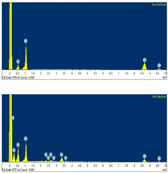 Energy-dispersive X-ray analysis of chemically synthesized ZnO (upper panel) and green synthesized ZnO (lower panel) nanoparticles.