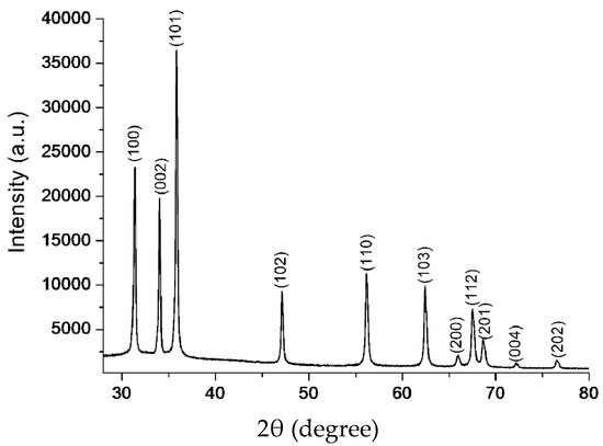 The powder XRD pattern of the CZnO-NPs was analyzed as it resulted in better effects based on the different tested variables in minced fish samples, as presented in Figure 3. All the peaks could be clearly assigned to the pure hexagonal Wurzite structure of ZnO, which could also be matched with the reported data (JCPDS number: 79–0206). Here, it is worth mentioning that the pattern was devoid of any other peaks, which clearly indicated that the sample was pure without any other contaminants.