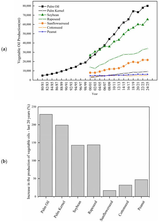 Vegetable oil production worldwide until 2024/2025. (a) Evolution of the production of vegetable oil over the last four decades; and (b) increase in the production of vegetable oil in the last 20 years [1].