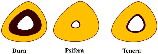 The African oil palm can be classified into dura, pisifera, and tenera according to the thickness of the endocarp covering the kernel (Figure 3). Dura is the predominant type, with a frequency of approximately 97% in wild palm groves; tenera is a hybrid of dura and psifera [2,8,9].