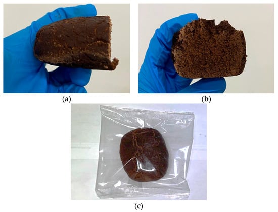 A general characterization of the freshly baked product (Figure 1a–c) was performed to assess the main features. Moisture, water activity (aW), and colorimetric and textural properties are reported in Table 2. CPF-based bread resulted in 33.1 ± 0.26 for moisture (%) and water activity (aw) of 0.927 ± 0.001. Concerning color attributes, our bread had a uniform brown coloration, slightly lighter on the crust. Dynamometric analysis assessed the texture properties, recording the values of hardness and friability (161.3 ± 30.6 N, 0.26 ± 0.07 mm−1, respectively).