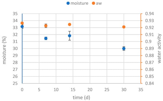 Results of moisture and water activity trend during packaged storage, in ASL conditions (40 °C, no light).