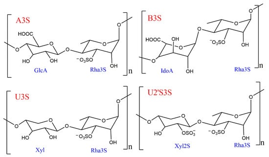 The structure of ulvan is mainly composed of sulfated rhamnose (Rha3S), glucuronic acid (GlcA), iduronic acid (IdoA), xylose (Xyl), and xylose-2-sulfate (Xyl2S) [11]. The four disaccharide structural units of the polysaccharide backbone are shown in Figure 1, A3S [→4)-β-D-GlcA-(1→4)-α-L-3-Rha3S-(1→] and B3S [→4)-α-L-IdoA-(1→4)-α-L-3-Rha3S-(1→], U3S: [→4)-β-D-Xyl-(1→4)-α-L-3-Rha3S-(1→], and U2′S3S: [→4)-β-D-sulfated Xyl-(1→4)-α-L-3-Rha3S(1→] [6,13]. The content and composition of these disaccharides vary depending on the cultivation environment and extraction method. The structural components, in terms of dry weight percentage, include rhamnose (16.8–45%), xylose (2.1–12%), glucose (0.5–6.4%), glucuronic acid (6.5–19%), sulfate (16–23.2%), and aedugaric acid (1.1–23.2%).