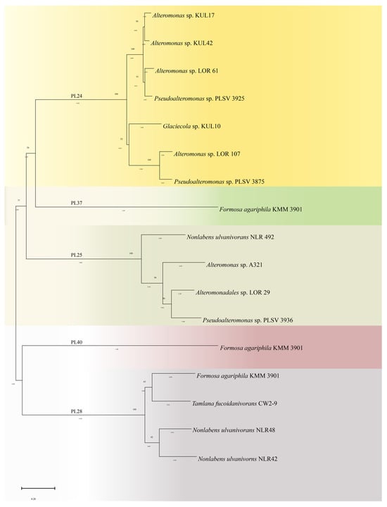 Currently, ulvan lyases are divided into five families, that is PL24, PL25, PL28, PL37, and PL40, based on the amino acid sequence. There are seven members of the PL24 family in the CAZy database, which are derived from Alteromonas sp. KUL17 [54], Alteromonas sp. KUL42 [54], Alteromonas sp. LOR_107 [55], Alteromonas sp. LOR_61 [55], Glaciecola sp. KUL10 [54,56], Pseudoalteromonas sp. PLSV_3875 [57] and Pseudoalteromonas sp. PLSV_3925 [55]. Two PL25 family members in CAZy are derived from Alteromonas sp. A321 [58], and Pseudoalteromonas sp. PLSV_3936 [59]. Although LOR_29 [60] from Alteromonadales sp. and NLR_492 [60] from Nonlabens ulvanivorans were not included in the CAZy database, they have been included in the GenBank under the numbers WP_052010178.1 and WP_036580476.1, respectively. PL28 family members are derived from Formosa agariphila KMM 3901 [61], Nonlabens ulvanivorns NLR48 [62] and Nonlabens ulvanivorns NLR42 [53]. In addition, PL37 [63], as well as PL40 [64], derived from Formosa agariphila KMM 3901 [61], were also included in the CAZy database. Besides, Olivier et al. [10] successfully isolated a microbial species capable of secreting ulvan lyase. Through 16S rRNA sequencing, the microbial species’ gene was identified as GIIUL2 and its affiliation with the genus Alteromonas. However, in comparison to the registered species available in GenBank, the homology of this species was less than 95%. Consequently, the classification of the ulvan lyase produced by this species into a specific PL family remains uncertain.