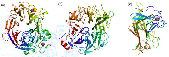 Generally, the enzyme 3D structures are essential for understanding catalytic mechanisms. Three families of ulvan lyase have been resolved, that is LOR_107 of the PL24 family (PDB ID: 6BYP) [70], PLSV_3936 of the PL25 family (PDB ID: 5UAM) [58], and NLR48 of the PL28 family (PDB ID: 6D2C) [62], respectively. Recently, a new structure, Uly1 of the PL24 family (PDB ID: 7CZH) [71], has also been determined, which is consistent with the conformation of 6BYP. The protein structures of three families are shown in Figure 4. The conformation of LOR_107 is consistent with that of PLSV_3936, which both adopt β-seven-bladed propeller structure (Figure 4a,b), whereas NLR48 of the PL28 family exhibits a β-sandwich jelly-roll conformation (Figure 4c).